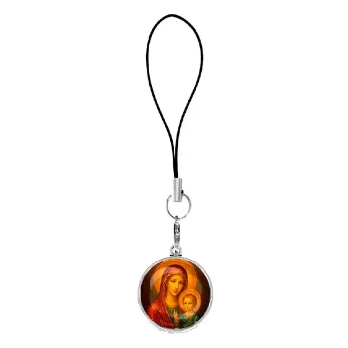 Подвеска для телефона — это стильный и символичный аксессуар, который объединяет в себе красоту и духовность. Изображение Матери Божьей с Иисусом выполнено из бижутерного сплава под серебро и защищено выпуклой стеклянной линзой. Основные особенности: