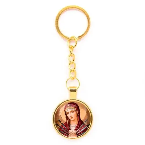 Круглый брелок с изображением Матери Божьей Семистрельной — это не только стильный аксессуар, но и символ защиты и духовной силы. Этот брелок выполнен из бижутерного сплава с покрытием под золото и дополнен стеклянной линзой, которая защищает изображение. Размер изделия (с кольцом и цепочкой) составляет 28х95 мм, что делает его удобным для ношения на ключах или в сумке.