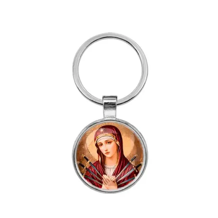 Круглый брелок с изображением Матери Божьей Семистрельной — это не только стильный аксессуар, но и символ духовной защиты. Изготовленный из бижутерного сплава с покрытием под серебро и стекла, он станет прекрасным дополнением к ключам или сумке. Размер изделия составляет 28х60 мм, а изображение защищено выпуклой стеклянной линзой, что придаёт ему особую выразительность.