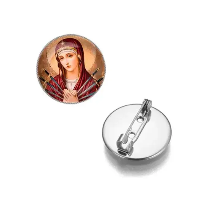 Круглый значок с изображением Семистрельной Матери Божьей — это не только стильный аксессуар, но и символ духовной защиты. Изготовленный из бижутерного сплава с покрытием под серебро и стеклом, этот значок станет прекрасным дополнением к любому наряду. Диаметр изделия составляет 26 мм, а изображение защищено выпуклой стеклянной линзой, что придаёт ему особую выразительность. Такой значок традиционно используется как оберег и может стать отличным подарком для близких или знакомых.