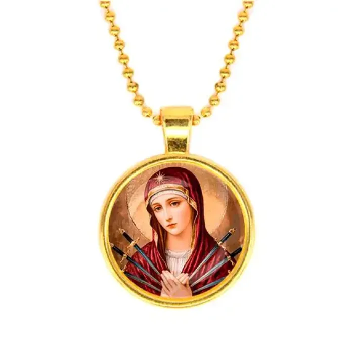 Кулон «Матерь Божья Семистрельная» — это изысканный аксессуар с глубоким символическим значением. Он олицетворяет защиту и покровительство, что делает его идеальным подарком для близких. Изготовленный из бижутерного сплава с покрытием под золото и дополненный стеклянной линзой, кулон не только красив, но и долговечен.