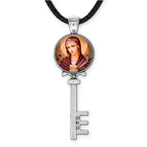 Кулон в форме ключа с изображением Матери Божьей Семистрельной — символ веры и защиты. Этот изысканный аксессуар выполнен из бижутерного сплава с покрытием под бронзу и дополнен стеклянной линзой для защиты изображения. Размер кулона составляет 60 x 20 мм, а длина шнурка — 45 см. Застёжка типа лобстер обеспечивает надежное крепление. Такой кулон станет не только стильным украшением, но и значимым подарком для близких.