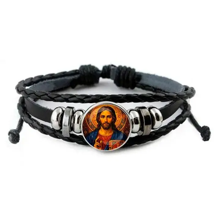 Кожаный браслет с изображением Иисуса Христа — это стильный аксессуар, который не только подчеркивает индивидуальность, но и несет в себе глубокий символический смысл. Этот браслет выполнен из искусственной кожи и украшен изображением диаметром 20 мм под выпуклой стеклянной линзой.