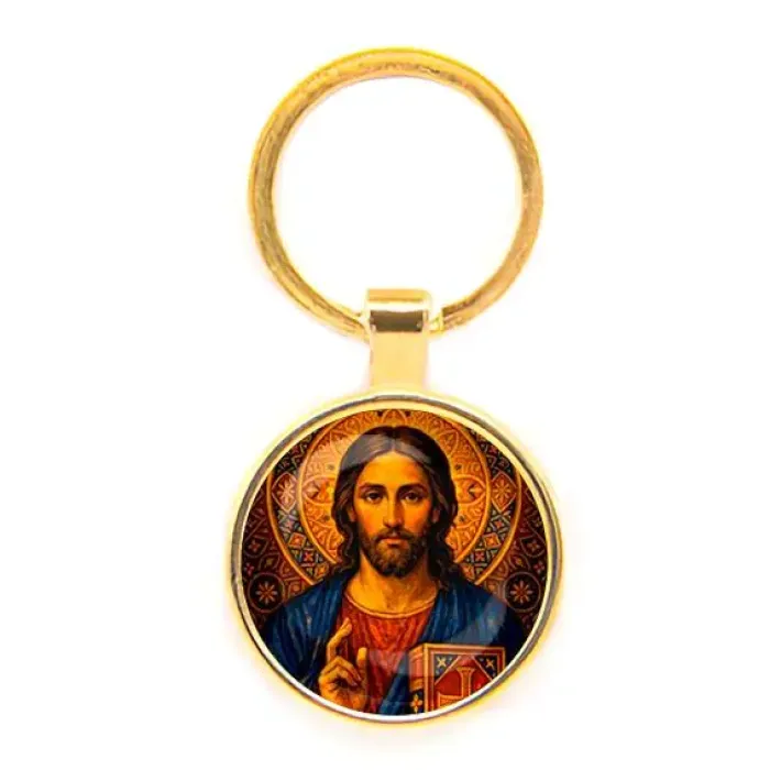 Круглый брелок с изображением Иисуса Христа — это не только стильный аксессуар, но и символ веры. Изготовленный из бижутерного сплава с покрытием под золото и стекла, он станет прекрасным дополнением к ключам или сумке. Основные особенности:
