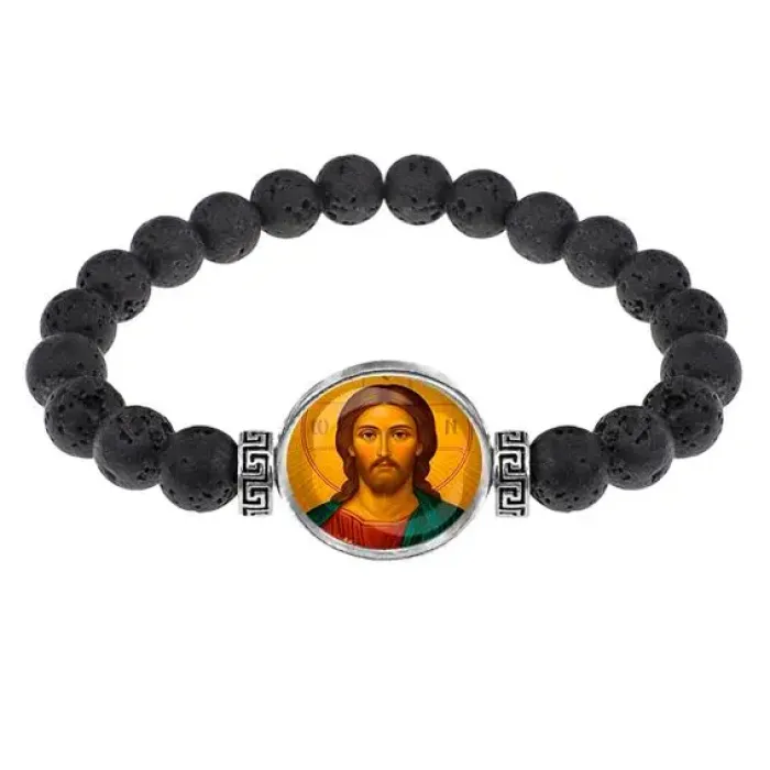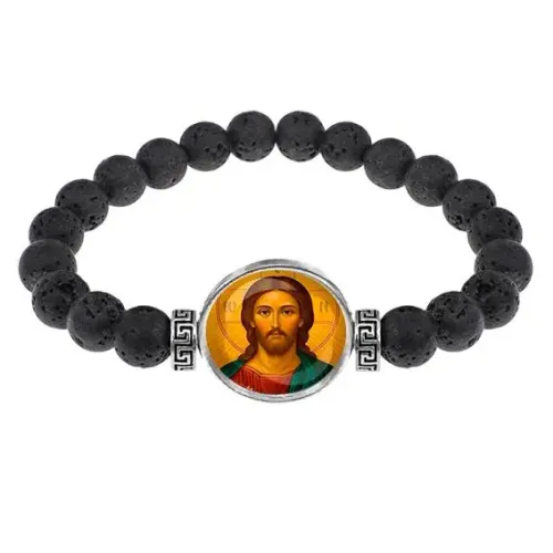 Стрейч-браслет из натуральной лавы диаметром 8 мм с изображением Иисуса Христа под выпуклой стеклянной линзой. Внутренний диаметр составляет около 5,5 см. Изготовлен из лавы, бижутерного сплава с покрытием под серебро и стекла. Этот браслет не только стильный аксессуар, но и традиционно используется в аромабижутерии: натуральный камень лава прекрасно впитывает эфирные масла. Достаточно нанести несколько капель любимого аромата на бусины для создания уникального запаха или комбинирования нескольких ароматов для особых моментов.