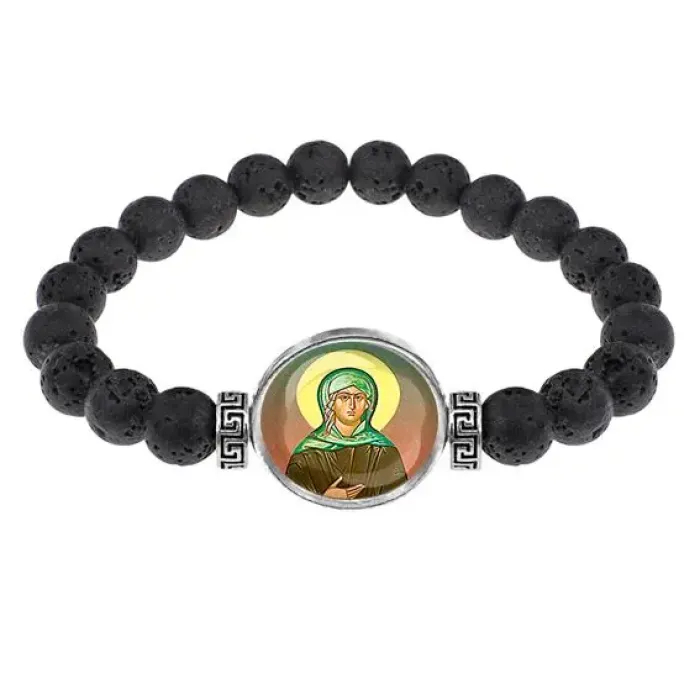 Стрейч-браслет из натуральной лавы диаметром 8 мм с изображением под выпуклой стеклянной линзой. Внутренний диаметр составляет около 5,5 см. Изготовлен из лавы, бижутерного сплава с покрытием под серебро и стекла. Лава известна своей способностью впитывать эфирные масла, что делает этот браслет идеальным для аромабижутерии. Нанесение нескольких капель эфирного масла на бусины позволяет создать уникальные ароматические композиции и наслаждаться их эффектом в течение дня.