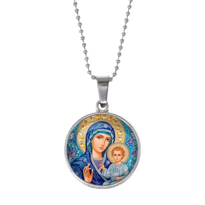 Кулон с изображением Матери Божией — это изысканный аксессуар, который сочетает в себе духовный символизм и стиль. Он выполнен из бижутерного сплава с покрытием под серебро и дополнен стеклянной линзой, защищающей изображение. Основные особенности: