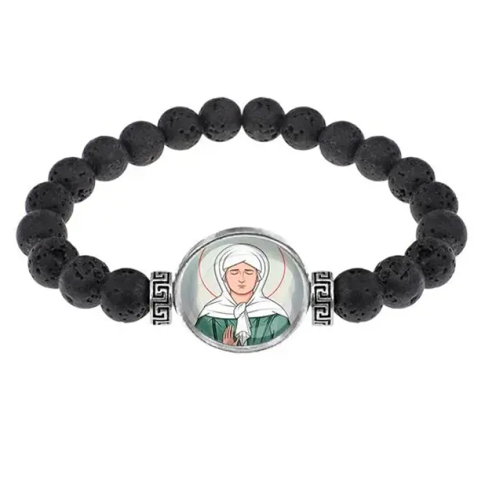 Стрейч-браслет из натуральной лавы диаметром 8 мм с изображением под выпуклой стеклянной линзой (20 мм). Внутренний диаметр составляет около 5,5 см. Изготовлен из лавы, бижутерного сплава с покрытием под серебро и стекла. Лава известна своей способностью впитывать эфирные масла, что делает этот браслет идеальным для аромабижутерии. Для активации аромабраслета достаточно нанести несколько капель эфирного масла на бусины, позволяя создавать уникальные ароматические композиции.