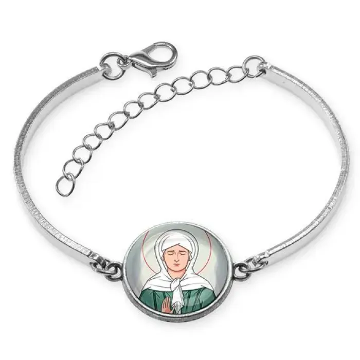 Браслет металлический из бижутерного сплава — это стильный аксессуар с глубоким культурным значением. Он украшен изображением диаметром 18 мм, защищённым выпуклой стеклянной линзой. Этот безразмерный браслет легко регулируется по руке, что делает его удобным для ношения в любой ситуации.