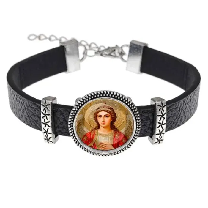 Браслет из искусственной кожи с изображением Архангела Михаила под выпуклой стеклянной линзой — символом защиты и силы. Регулируемый размер позволяет носить его на любой руке, что делает аксессуар универсальным и удобным. Материалы: искусственная кожа, бижутерный сплав с покрытием под серебро и стекло обеспечивают долговечность и стильный внешний вид. Этот браслет станет отличным дополнением к любому образу или подарком для близкого человека.