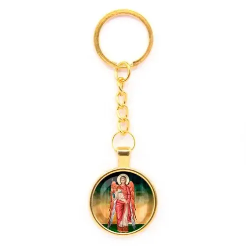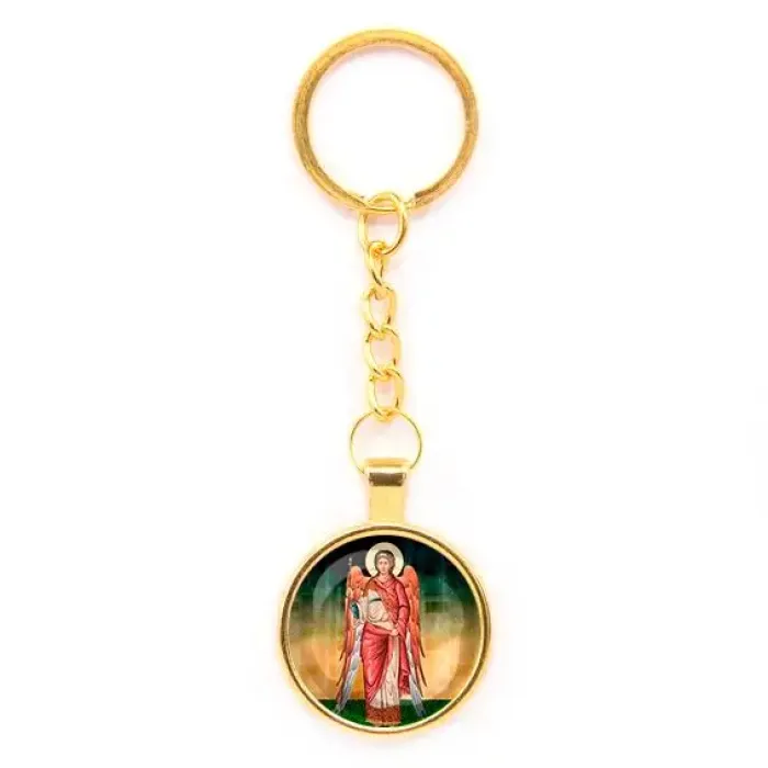 Круглый брелок с изображением Архангела Михаила — это не только стильный аксессуар, но и символ защиты и поддержки. Этот предмет традиционно ценится как оберег, который приносит удачу и спокойствие. Изготовленный из бижутерного сплава с покрытием под золото и стекла, он выглядит элегантно и привлекательно.