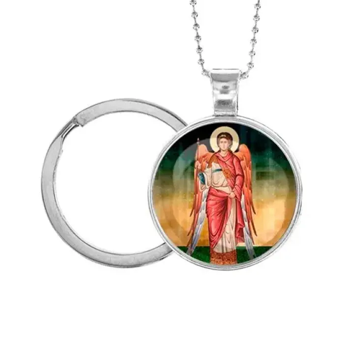 Кулон-брелок с изображением Архангела Михаила — это стильный аксессуар, который сочетает в себе функциональность и символику. Этот предмет традиционно ассоциируется с защитой и благословением, что делает его идеальным подарком для близких. Изготовленный из бижутерного сплава с покрытием под серебро и стекла, он обладает прочностью и элегантным внешним видом.