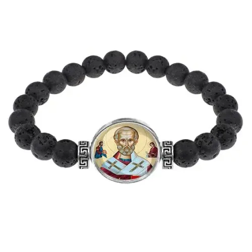 Стрейч-браслет из натуральной лавы диаметром 8 мм с изображением под выпуклой стеклянной линзой. Внутренний диаметр составляет около 5,5 см. Изготовлен из лавы, бижутерного сплава с покрытием под серебро и стекла. Этот браслет не только стильный аксессуар, но и практичный предмет для ароматерапии: лава хорошо впитывает эфирные масла, что позволяет использовать его в качестве аромабраслета. Нанесение нескольких капель масла на бусины создаст уникальные композиции ароматов. Традиционно такие украшения ценятся за свою способность создавать атмосферу спокойствия и гармонии.
