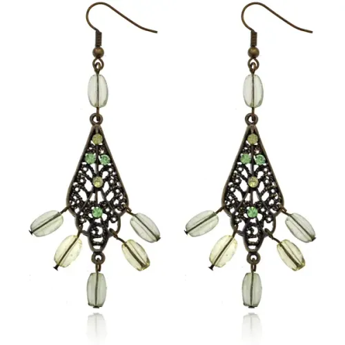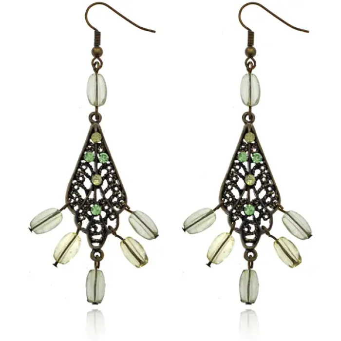 Серьги в форме листа из бижутерного сплава с декоративными стразами и бусинами.