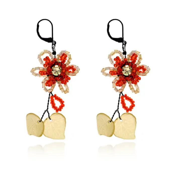 Серьги «Цветок и листья» желтого цвета из пластика с декором из бисера и страз.