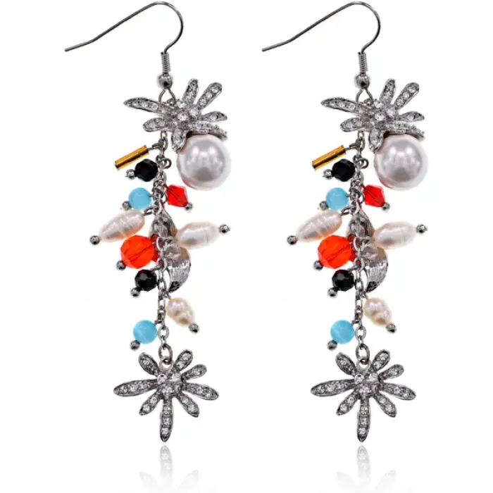 Серьги из бижутерного сплава с покрытием под серебро, с вставками из натурального и искусственного жемчуга, страз и бусин.