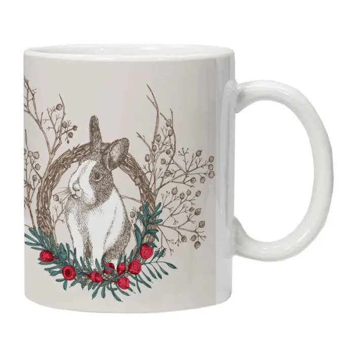 Кружка имеет классическую цилиндрическую форму с ручкой. Основным декоративным элементом является нанесённое изображение кролика.