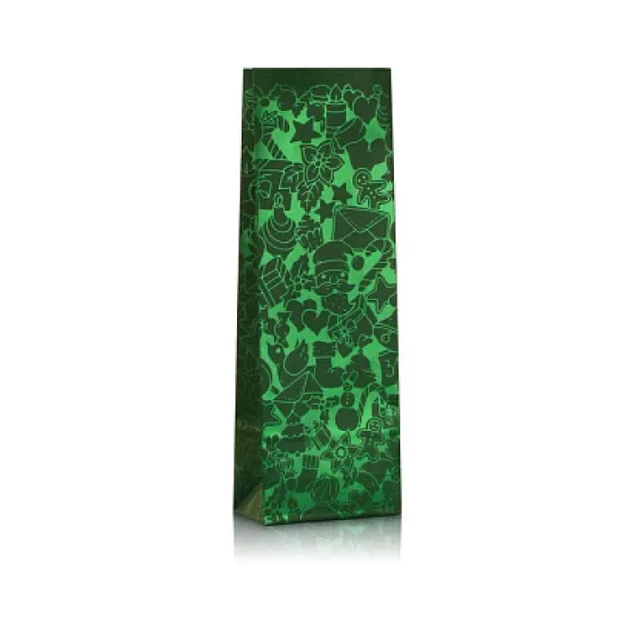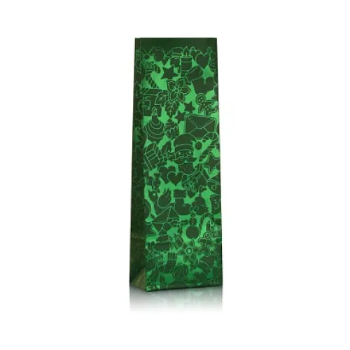 Подарочный пакет предназначен для упаковки и хранения чая. Он выполнен из плотной бумаги и имеет праздничный новогодний дизайн в зелёном цвете.
