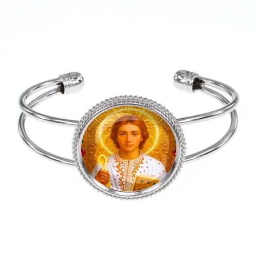 Металлический браслет с изображением святого Пантелеймона Целителя — символа здоровья и защиты. Изготовлен из бижутерного сплава с покрытием под серебро и стеклянной линзой диаметром 25 мм. Этот безразмерный аксессуар станет стильным дополнением к любому образу, а также подарит ощущение уверенности благодаря своему культурному значению. Браслет традиционно используется как оберег и украшение, что делает его отличным выбором для подарка или личного использования.