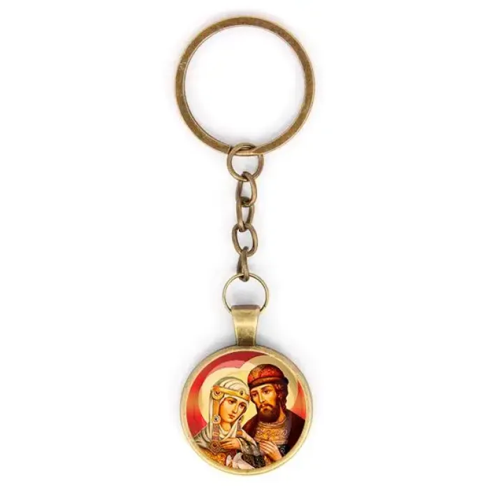 Круглый брелок с изображением святых Петра и Февронии — символа любви и верности. Этот стильный аксессуар станет прекрасным подарком для близких или украшением ключей. Изготовлен из бижутерного сплава с покрытием под бронзу и стекла, что придаёт ему особую элегантность. Размер брелка вместе с кольцом и цепочкой составляет 28х95 мм. Изображение защищено выпуклой стеклянной линзой, что обеспечивает его долговечность и яркость. Такой брелок традиционно ценится за свой глубокий смысл и может стать отличным оберегом в повседневной жизни.