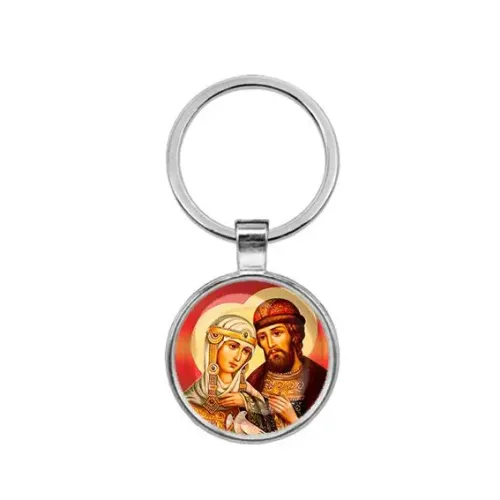 Круглый брелок с изображением святых Петра и Февронии — символ любви и верности. Этот стильный аксессуар выполнен из бижутерного сплава с покрытием под серебро и дополнен стеклянной линзой, защищающей изображение. Размер брелка с кольцом составляет 28х60 мм, что делает его удобным для повседневного использования. Такой брелок станет отличным подарком для близких или приятным дополнением к ключам. В народе образ Петра и Февронии олицетворяет семейные ценности и гармонию в отношениях.