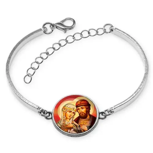 Металлический браслет с изображением святых Петра и Февронии — символа любви и верности. Этот стильный аксессуар выполнен из бижутерного сплава с покрытием под серебро, что придаёт ему элегантный вид. Изображение диаметром 18 мм защищено выпуклой стеклянной линзой, обеспечивая долговечность и яркость деталей. Браслет имеет безразмерную форму и легко регулируется по руке, что делает его удобным для ношения в любой ситуации. Традиционно этот браслет ценится как знак преданности и семейного счастья.