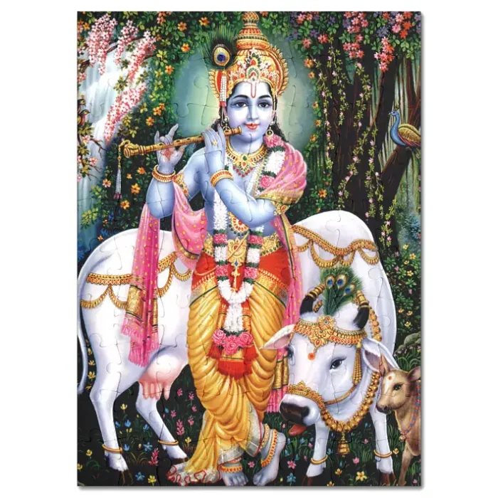 Пазл с изображением Кришны, изготовленный из мелованного картона с глянцевой поверхностью.