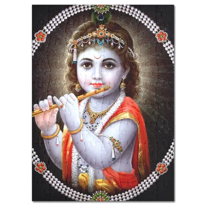 Пазл с изображением Кришны. Изготовлен из мелованного картона с глянцевой поверхностью.