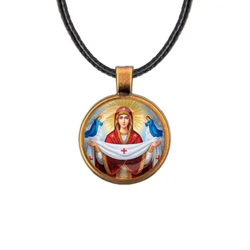 Кулон с изображением Покрова Божией Матери — это не только стильный аксессуар, но и символ защиты и благословения. Изготовленный из бижутерного сплава с покрытием под бронзу и стекла, он станет прекрасным дополнением к любому образу. Основные особенности: