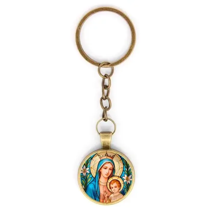 Круглый брелок с изображением Пресвятой Богородицы — это не только стильный аксессуар, но и символ духовной защиты. Изготовленный из бижутерного сплава с покрытием под бронзу и стекла, этот брелок станет прекрасным подарком для близкого человека или украшением ключей. Размер изделия составляет 28х95 мм вместе с кольцом и цепочкой. Выпуклая стеклянная линза надежно защищает изображение, придавая ему дополнительную выразительность.