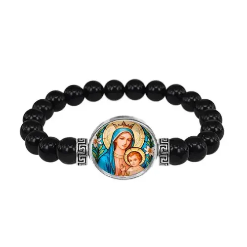 Стрейч-браслет из натурального камня Чёрный агат диаметром 8 мм — это не только стильный аксессуар, но и символ духовной силы. Изображение Пресвятой Богородицы диаметром 20 мм расположено под выпуклой стеклянной линзой, что придаёт изделию особую выразительность. Сеттинг выполнен из бижутерного сплава с покрытием под серебро, что обеспечивает долговечность и элегантный внешний вид. Такой браслет станет прекрасным подарком для близких или значимым дополнением к личной коллекции украшений.