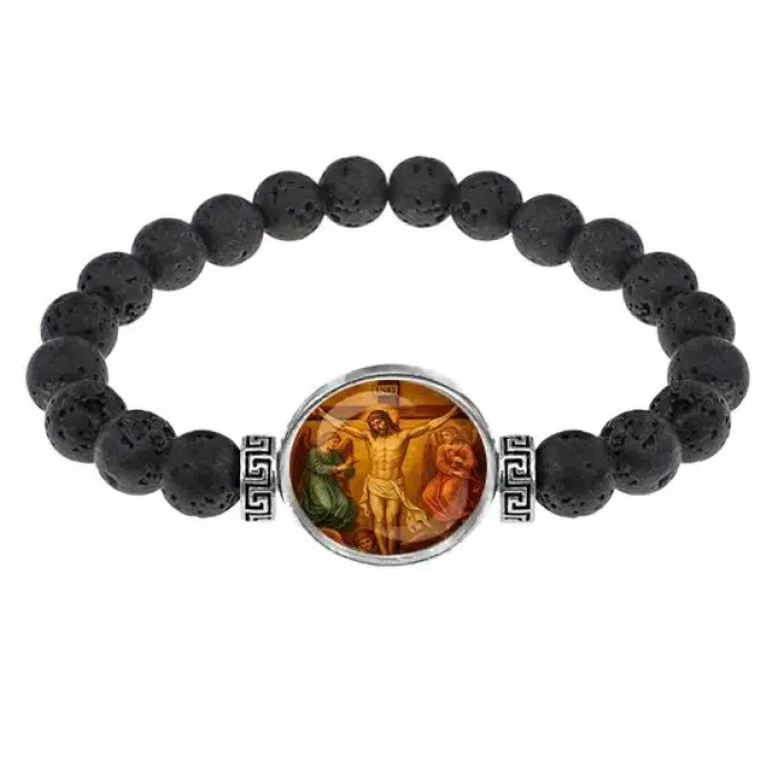 Стрейч-браслет из натуральной лавы диаметром 8 мм с изображением под выпуклой стеклянной линзой (20 мм). Внутренний диаметр составляет ~5,5 см. Изготовлен из лавы, бижутерного сплава с покрытием под серебро и стекла. Натуральный камень лава известен своей способностью впитывать эфирные масла, что делает его идеальным для аромабижутерии. Нанесение нескольких капель эфирного масла на бусины позволяет создавать уникальные ароматические композиции. Такой браслет станет не только стильным аксессуаром, но и источником приятных запахов в течение дня.