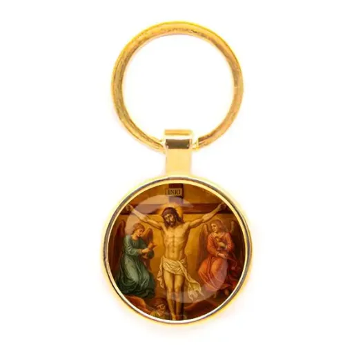 Круглый брелок с изображением распятия — это не только стильный аксессуар, но и символ веры. Изготовленный из бижутерного сплава с покрытием под золото и стеклом, он станет прекрасным дополнением к ключам или сумке. Размер брелка вместе с кольцом составляет 28х60 мм, что делает его компактным и удобным в использовании. Защищенное выпуклой стеклянной линзой изображение придаёт ему особую выразительность и долговечность. Этот брелок может стать значимым подарком для близкого человека или украсить собственные ключи.