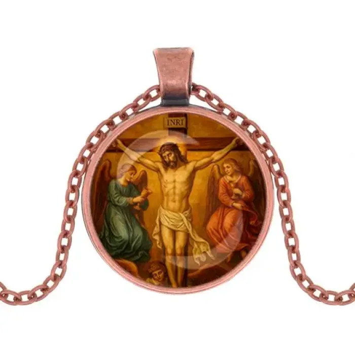 Этот изысканный кулон в цвете меди с изображением распятия станет не только стильным аксессуаром, но и символом веры. Он выполнен из бижутерного сплава с покрытием под медь и дополнен стеклянной линзой, которая защищает изображение.