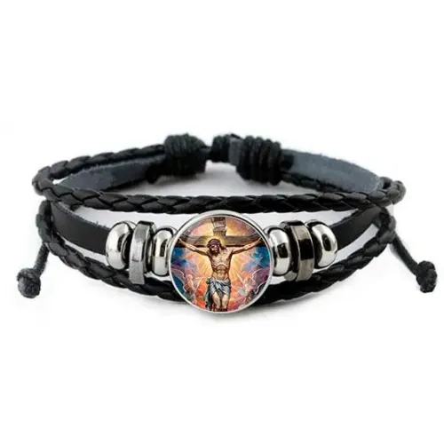 Кожаный браслет с изображением распятия — это стильный аксессуар, который сочетает в себе современный дизайн и глубокий символизм. Этот браслет из искусственной кожи украшен изображением диаметром 20 мм под выпуклой стеклянной линзой, что придаёт ему особую выразительность.