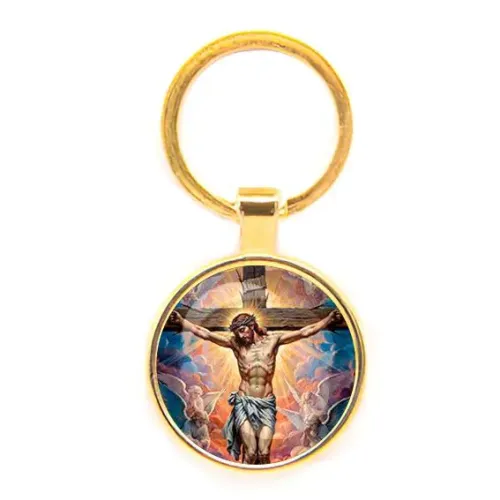 Круглый брелок с изображением распятия — это не только стильный аксессуар, но и символ веры. Изготовленный из бижутерного сплава с покрытием под золото и стекла, он сочетает в себе прочность и элегантность. Размер брелка (с кольцом) составляет 28х60 мм, что делает его удобным для ношения на ключах или сумке. Защищенное выпуклой стеклянной линзой изображение добавляет яркости и выразительности этому изделию. Такой брелок станет отличным подарком для близких или элементом личного стиля.