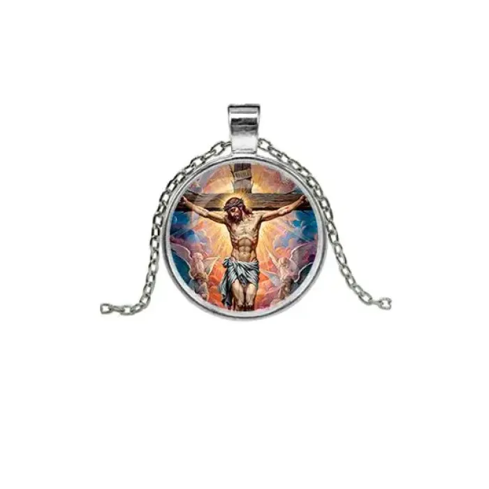 Кулон «Распятие» — это изысканный аксессуар, который сочетает в себе символику и стиль. Он выполнен из бижутерного сплава с покрытием под серебро и дополнен стеклянной линзой, защищающей изображение.