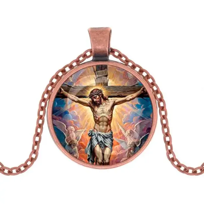 Кулон в виде распятия — это не только стильный аксессуар, но и символ веры. Он выполнен из бижутерного сплава с покрытием под медь и дополнен стеклянной линзой, защищающей изображение. Данный кулон станет прекрасным подарком или личным украшением для тех, кто ценит духовные символы.