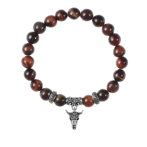 Браслет-амулет из натурального камня бычий глаз с подвеской в виде черепа быка.