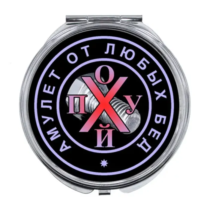 Складное зеркало сувенирное, изготовленное из металла и стекла, с полноцветным изображением.
