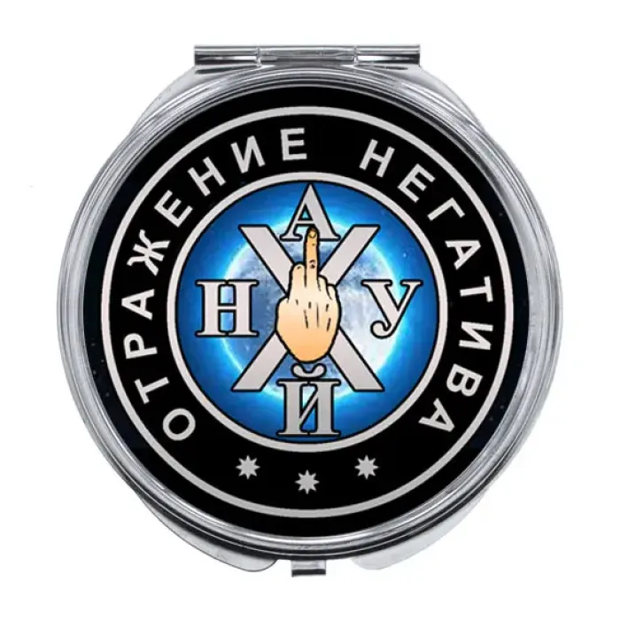 Складное зеркало для личного использования. Изготовлено из металла и стекла, имеет полноцветное изображение.