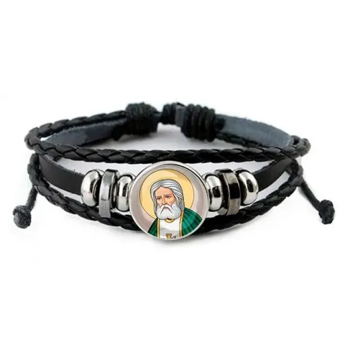 Кожаный браслет с изображением Серафима Саровского — это стильный аксессуар, который сочетает в себе духовность и современный дизайн. Изготовленный из высококачественной экокожи, он украшен изображением диаметром 20 мм под выпуклой стеклянной линзой. Браслет безразмерный и регулируется по руке, что делает его удобным для носки. Металлические элементы выполнены из бижутерного сплава с покрытием под серебро, добавляя изделию элегантности. Этот браслет станет не только модным акцентом в образе, но и символом веры и благочестия.