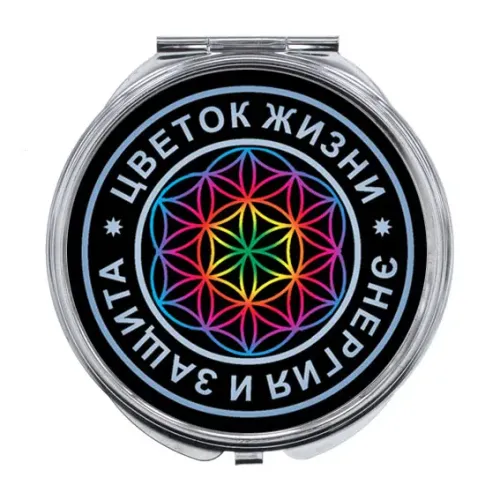 Складное зеркало с изображением «Цветок жизни». Материалы: металл, стекло.