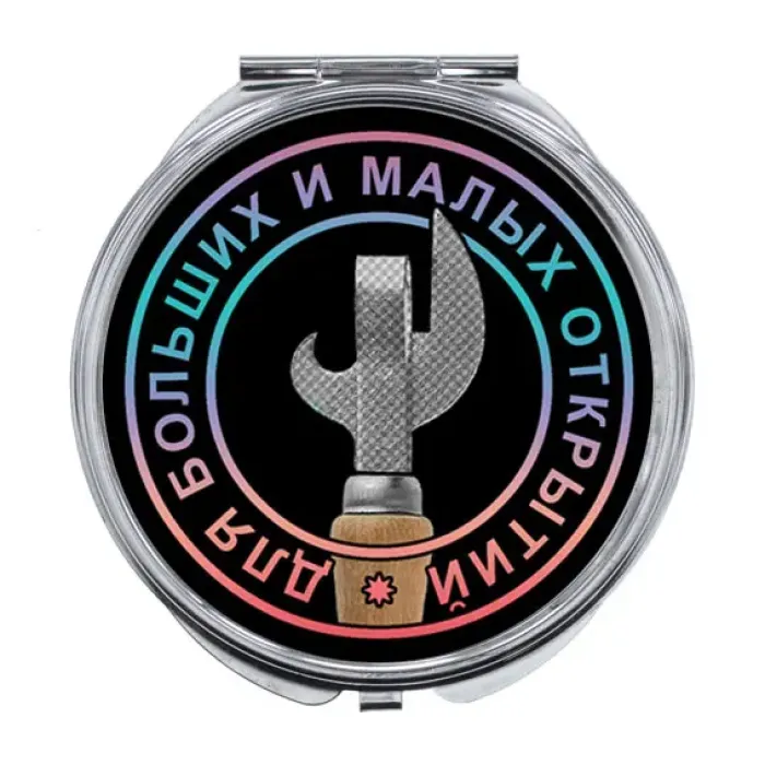 Складное зеркало сувенирное, изготовленное из металла и стекла, с полноцветным изображением.