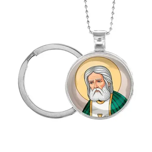 Кулон-брелок с изображением Серафима Саровского — это стильный аксессуар, который сочетает в себе красоту и функциональность. Он выполнен из бижутерного сплава с покрытием под серебро и стекла, что придаёт ему элегантный вид. Основные особенности включают: