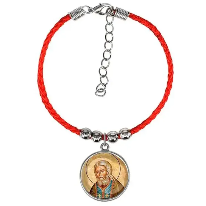 Браслет из красного шнура — это не только стильный аксессуар, но и символ духовной защиты. Изображение святого Серафима Саровского, заключенное в выпуклое стекло на металлической основе, придает изделию особую значимость. Максимальный диаметр браслета составляет 7,5 см и регулируется по размеру руки. Изготовлен из прочного шнура и бижутерного сплава с покрытием под серебро, что обеспечивает долговечность и комфорт при ношении. Диаметр изображения составляет 20 мм, что делает его заметным акцентом в любом образе.