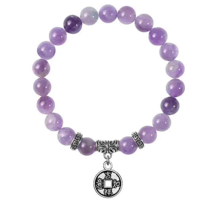 Браслет-амулет из натурального аметиста с подвеской из бижутерного сплава.