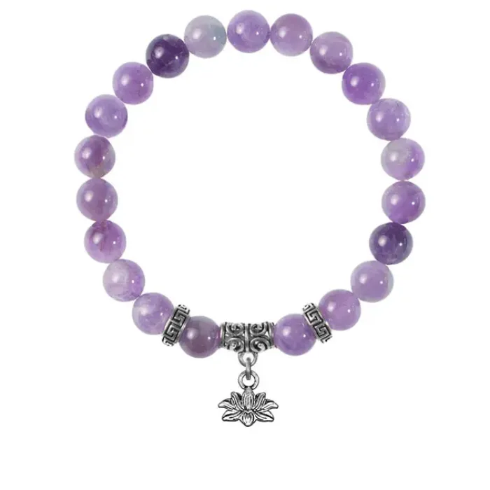 Браслет из натурального аметиста с подвеской-талисманом в виде лотоса из бижутерного сплава.
