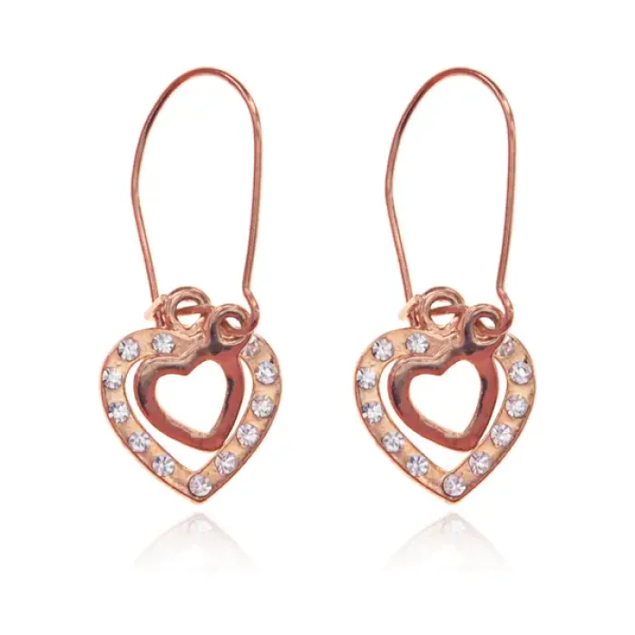 Серьги «Два сердца» — бижутерный аксессуар в форме двух сердец с инкрустацией стразами и золотым покрытием.