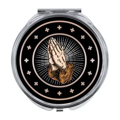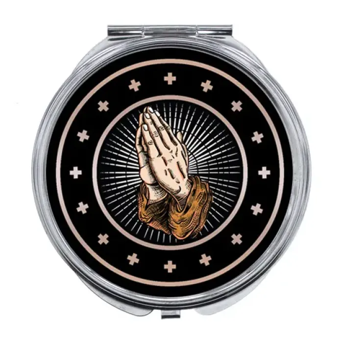 Складное зеркало для личного использования, изготовленное из металла и стекла с полноцветной печатью.